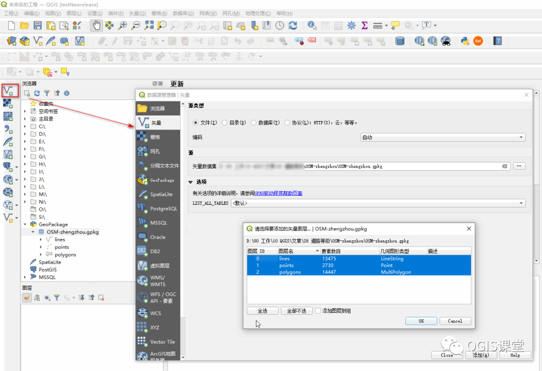 【添加矢量图层】按钮,找到下载的数据,将points、lines、polygons三个图层添加到地图窗口: