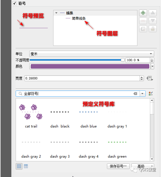 在【编辑规则】面板的下方嵌入了符号选择器组件(Symbol selector widget),通过这个界面可以为该规则选择预定义符号库中的符号,或者根据需要自定义新的线状符号: