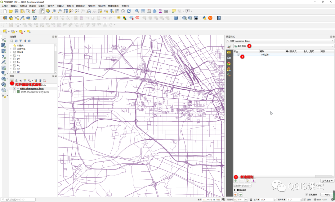 points、lines和polygons分别对应从OpenStreetMap下载的点、线、面三个要素集合,在图层面板将points和polygons设置为不显示,这两个图层作为背景数据,暂时先不显示到地图窗口。