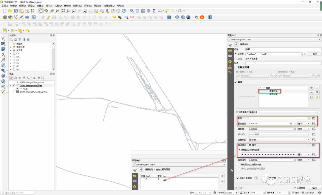 使用自定义横划图案:勾选“使用自定义横划图案”,并点击下方的短横线按钮,在弹出的“自定义横划图案”面板中,设置短横为1.5mm、空格为3mm。这个步骤是铁路线状符号效果的关键。
