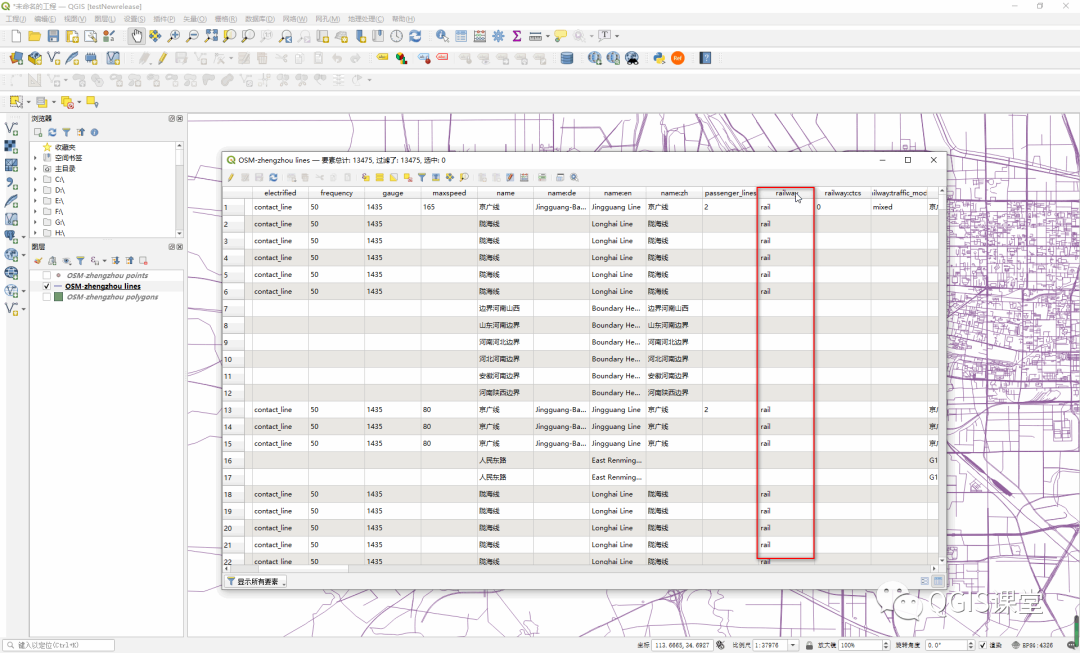 右键点击lines图层->【打开属性表】,可以看到该图层用“railway”字段表示要素是否为铁路,属性取值如下: