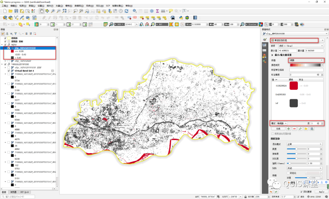 图层面板点击选中2019年10月NDVI对应的图层,如“NDVI2019”,右侧图层样式面板中,设置如下参数: