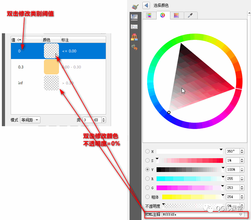 接下来我们开始观察和调整NDVI的阈值。根据NDVI指数的特点及经验,取初始裸地阈值为0<NDVI<=0.3(为演示精细提取裸地的功能,设定一定上下限范围,在实际业务测量中,也可以不设置下限范围,即提取出非植被区域也是可行的)。双击分类列表中的值,可以调整阈值;双击分类列表中的颜色块,修改类别对应的颜色。由于只需要提取裸地像元,可以设置NDVI小于0和NDVI大于0.3这两个类别为透明色,便于与多波段RGB影像叠加判别,如下图所示: