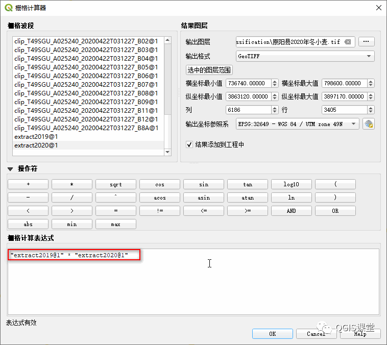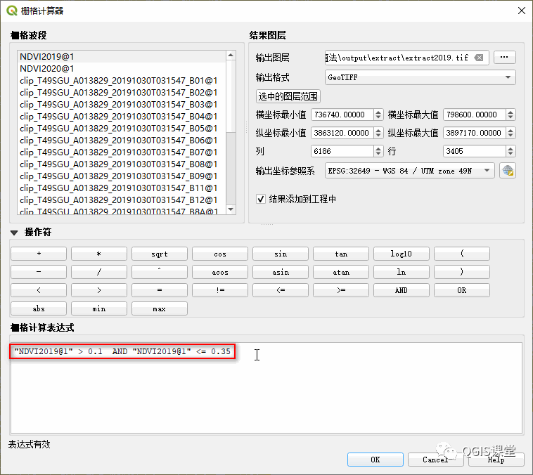 点击菜单【栅格】->【栅格计算器】,打开栅格计算器对话框,输入下列表达式: