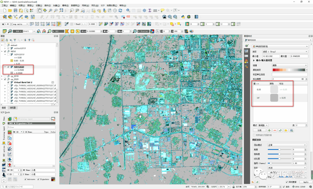 NDVI指数越大,表示植被生长状况越好。因此,对于2020年4月的NDVI指数,只需要确定一个下限阈值即可,调整方式与裸地相同,例如假设NDVI>0.35表示植被,可以将NDVI>0.35用比较醒目的颜色表示,与RGB假彩色影像叠加,观察是否将所有植被正确归类。