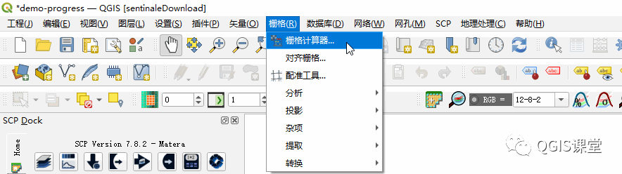 点击菜单【栅格】->【栅格计算器】,打开栅格计算器对话框。