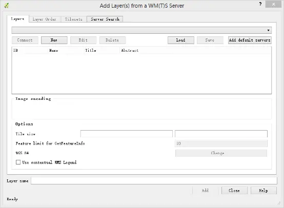 我们通过点击工具栏中的Add WMS Layer button 来加载WMS图层,类似加载SpatiaLite数据库图层,图层数据是存储在数据库中的,为了使用这些图层,我们首先要连接这些数据库。而添加WMS图层,需要先连接远程服务器。