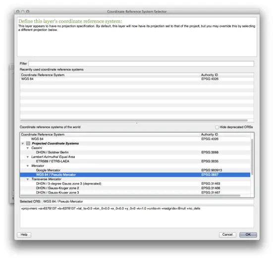 由于我们不使用WGS84坐标系,我们需要重新选择,点Change按钮,将显示坐标系对话框。我们需要一个投影坐标系,选择WGS 84 / Pseudo Mercator。