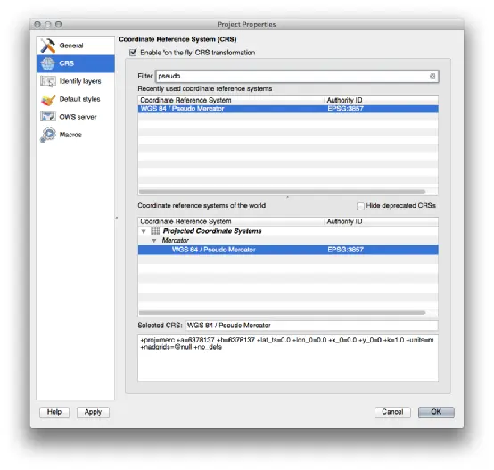 在 SETTING->Project Properties dialog对话框中的 CRS TAB页中,输入pseudo 过滤坐标系