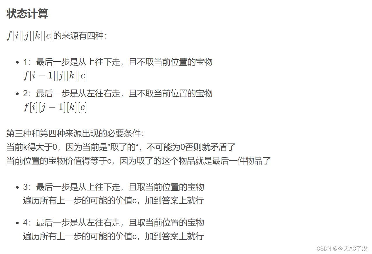 f[i , j ,k ,c]表示:所有从起点走到( i , j ),并已经取了k件物品,并且最后一件物品的价值为c的方案数,值是数量。