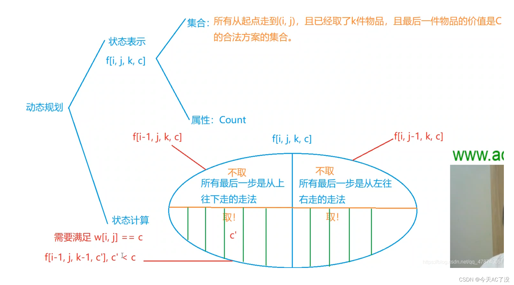 因为里面有坐标i,j从两个方向来,还有k件物品需要维护,另外还有最后一件物品的价值c需要维护,因为需要c来比较,是否取不取,这样就可以表示出,这个问题了。