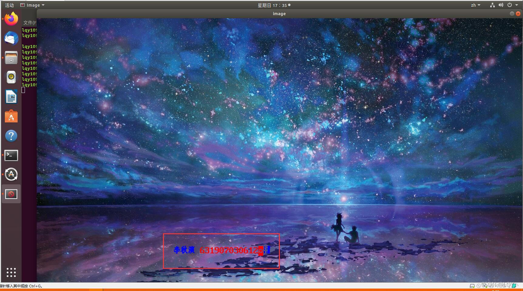 实验要求:在Ubuntu下用C/C++(或python) 调用opencv库编程显示一张图片,并打开一个名为"logo.txt"的文本文件(其中只有一行文本文件,包括你自己的名字和学号),按照名字和学号去读取汉字24*24点阵字形字库(压缩包中的文件HZKf2424.hz)中对应字符的字形数据,将名字和学号叠加显示在此图片右下位置。