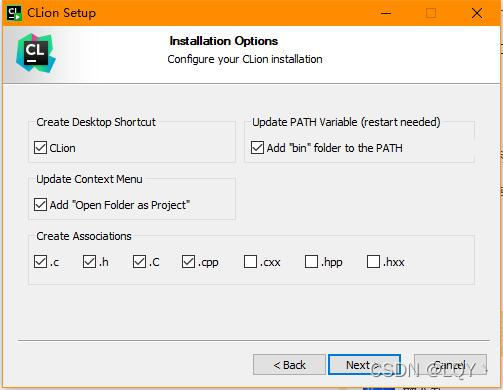 打开运行下载的 JetBrains CLion v2021.2 Winx64.exe 安装文件,勾选对应选项