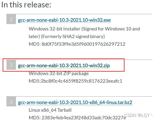 进入网页后,点击 gcc-arm-none-eabi-10.3-2021.10-win32.zip 下载