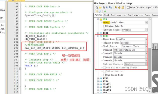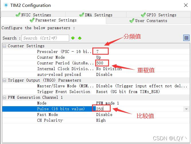 设置2khz的公式:2khz=时钟输入频率(默认8M)/(分频值7+1)/重载值(500),默认占空比50%(比较值500*50%=250)
