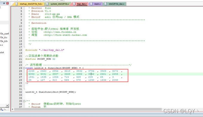 打开文件bsp_dac.c,将正弦波数据换成音频文件生成的数据,修改POINT_NUM为适当大小