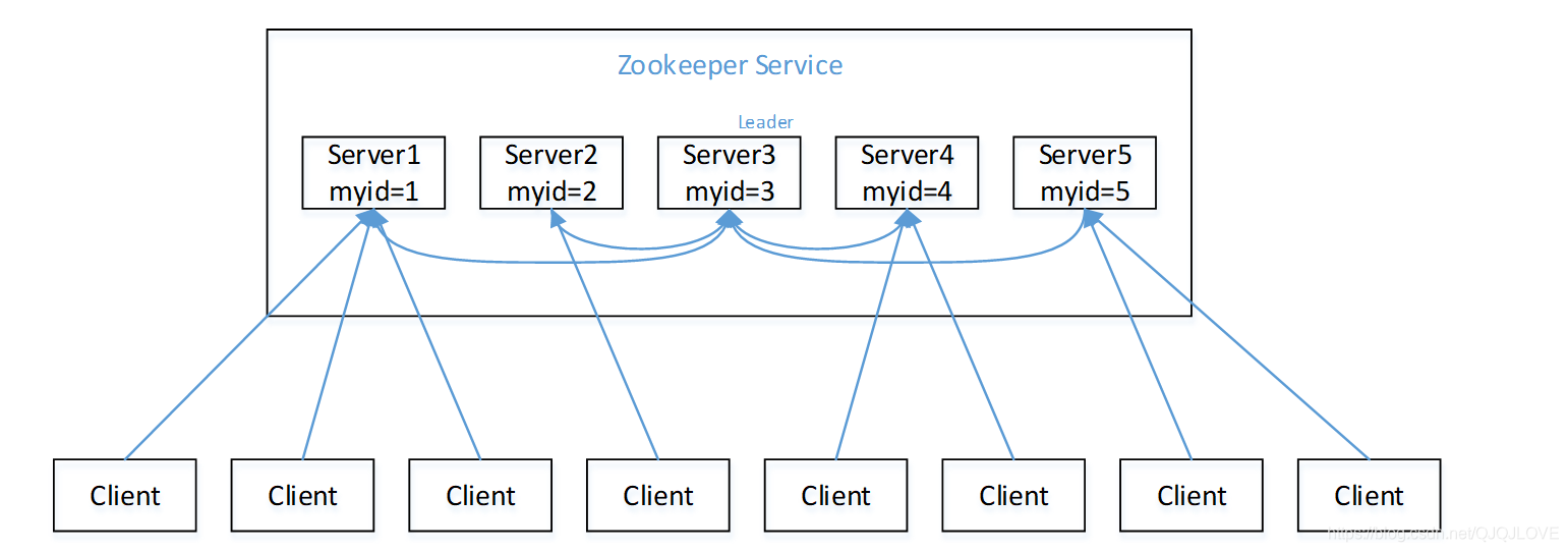 假设有五台服务器组成的Zookeeper集群,它们的id从1-5,同时它们都是最新启动的,也就是没有历史数据,在存放数据量这一点上,都是一样的。