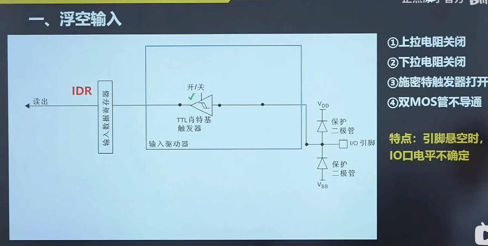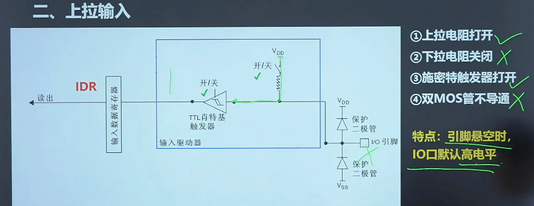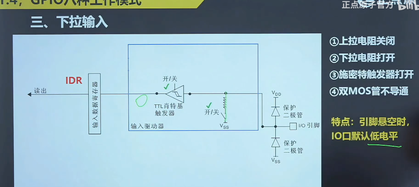 下拉电阻:当开关闭合,电阻将引脚通过高阻值电阻连接到VSS,使引脚在悬空时保持稳定的低电平。