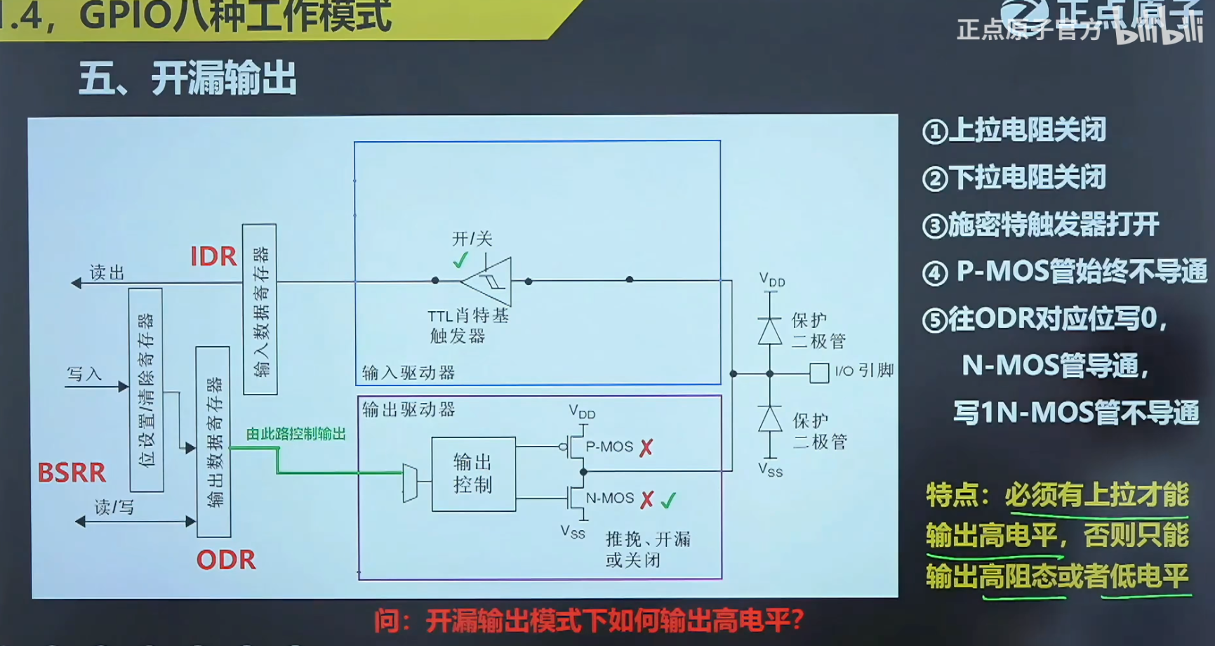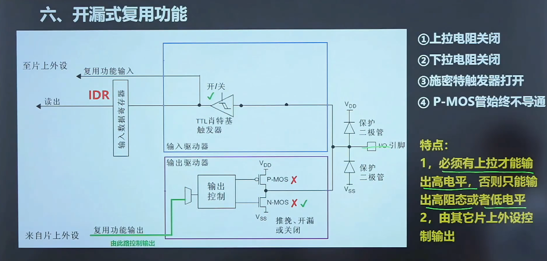 开漏输出:在此模式下,P-MOS被永久禁用。只有N-MOS工作。当N-MOS导通时,输出低电平;当N-MOS截止时,引脚呈高阻态,电平由外部上拉电阻决定。这种模式便于电平转换和实现“线与”逻辑。