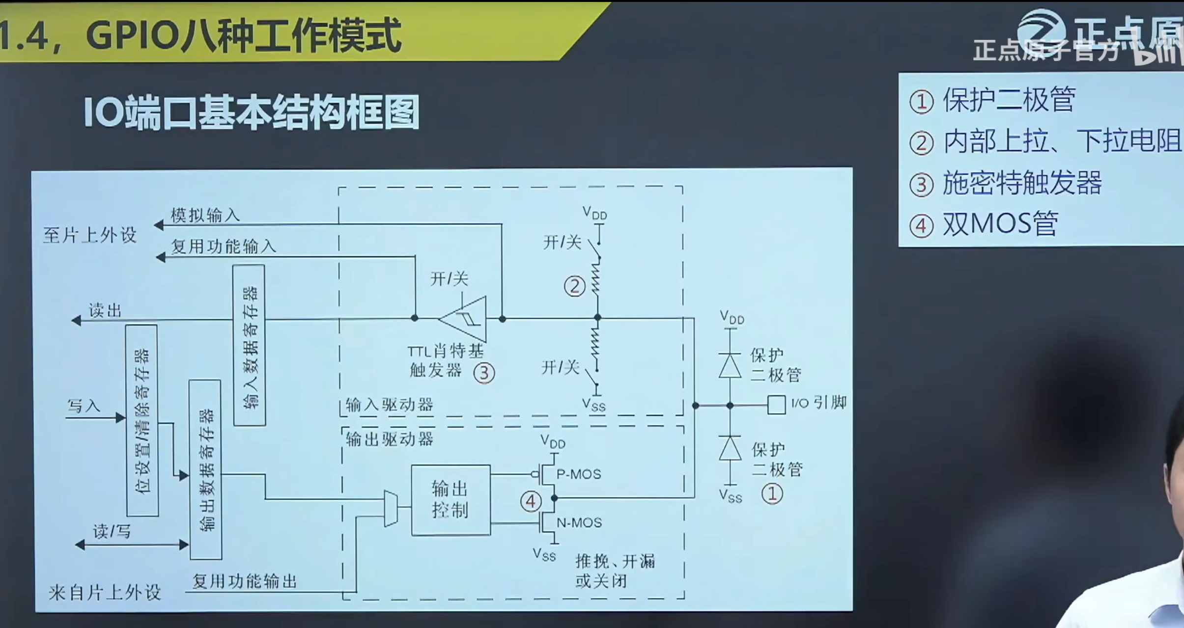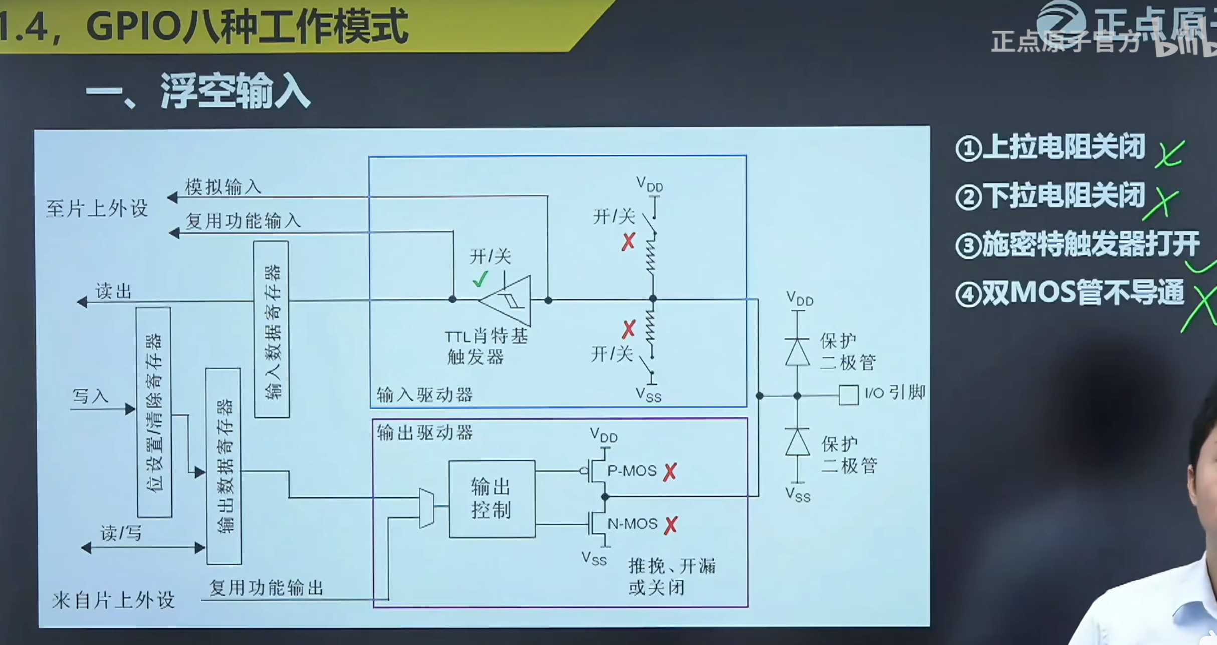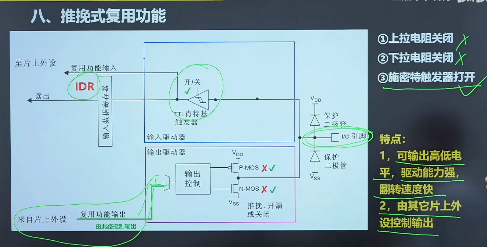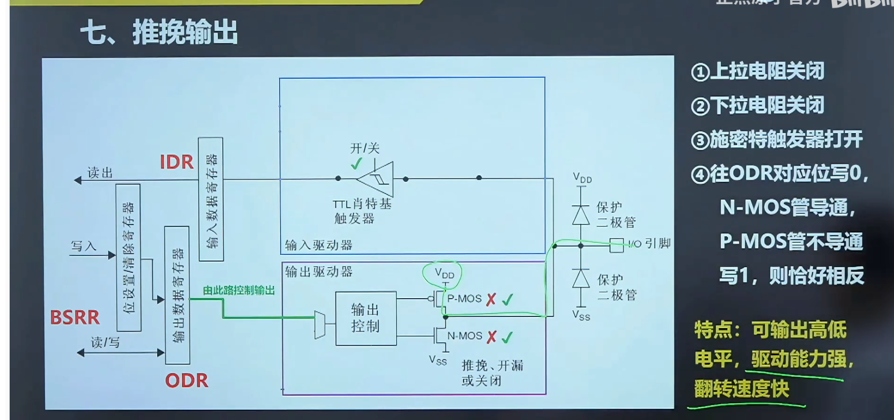 N-MOS:作为下拉开关。当输出低电平时,N-MOS导通,P-MOS截止,电流从引脚通过N-MOS流向VSS,将引脚拉低至地电平。