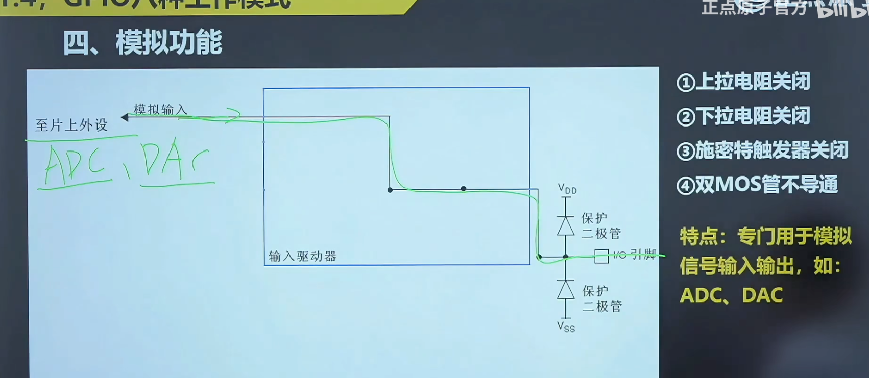 在标准的GPIO框图里,保护二极管通常是普通的PN结二极管。但肖特基二极管因其低正向压降和高速开关特性,有时也会被用于高性能或低电压应用的I/O保护电路中。