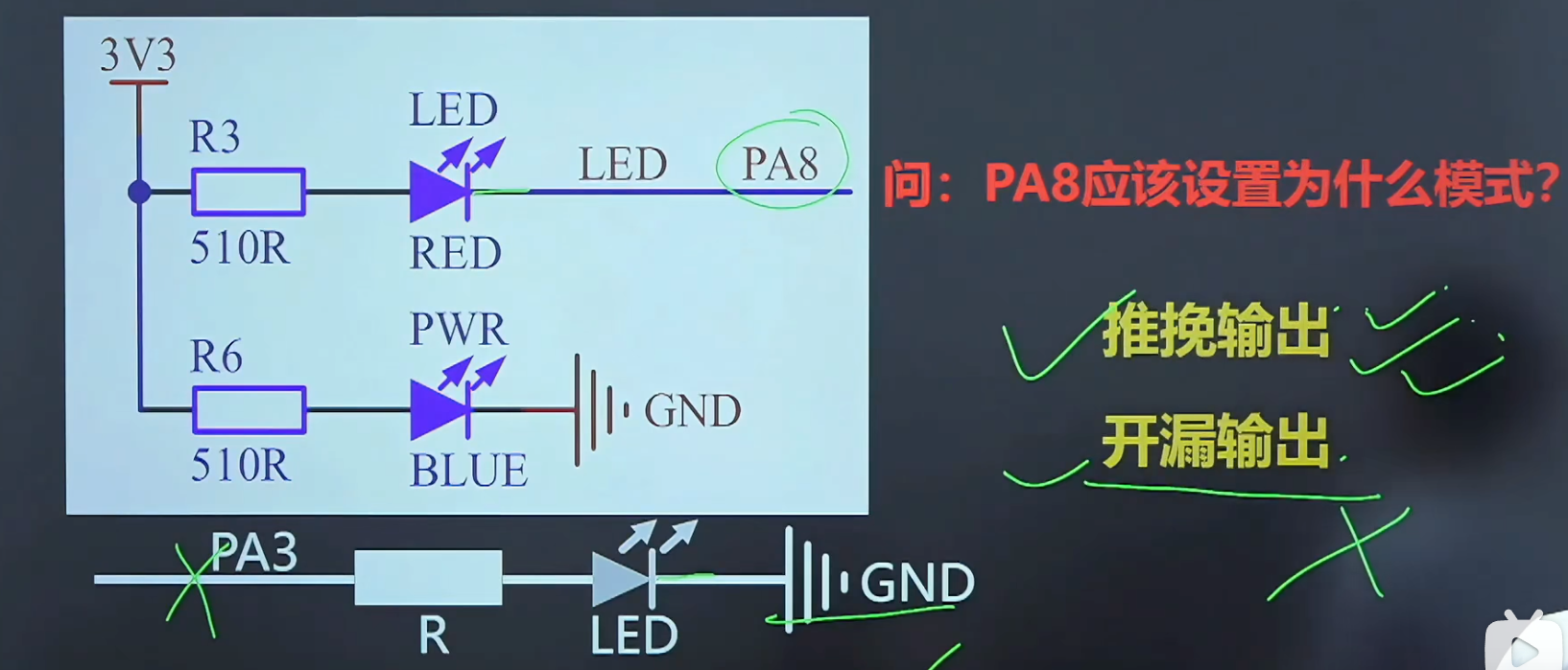 根据情况对PA8,推挽输出,开漏输出都可以;PA3仅推挽输出