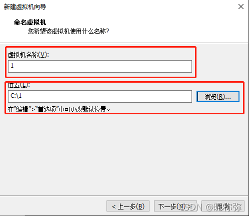 5、虚拟机名字,自己设置。虚拟机文件保存位置,自己定义。下一步。