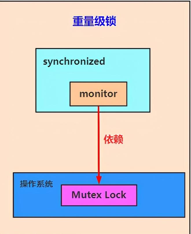 重量级锁是一种称谓: synchronized是通过对象内部的一个叫做监视器锁(monitor)来实现的,监视器锁本身依赖底层的操作系统的 Mutex Lock来实现。操作系统实现线程的切换需要从用户态切换到核心态,成本非常高。这种依赖于操作系统 Mutex Lock来实现的锁称为重量级锁。为了优化synchonized,引入了轻量级锁,偏向锁。