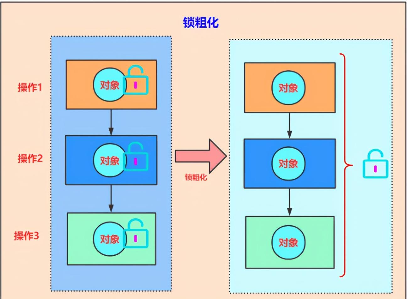 锁粗化是一种优化技术: 如果一系列的连续操作都对同一个对象反复加锁和解锁,甚至加锁操作都是出现在循环体体之中,就算真的没有线程竞争,频繁地进行互斥同步操作将会导致不必要的性能损耗,所以就采取了一种方案:把加锁的范围扩展(粗化)到整个操作序列的外部,这样加锁解锁的频率就会大大降低,从而减少了性能损耗。