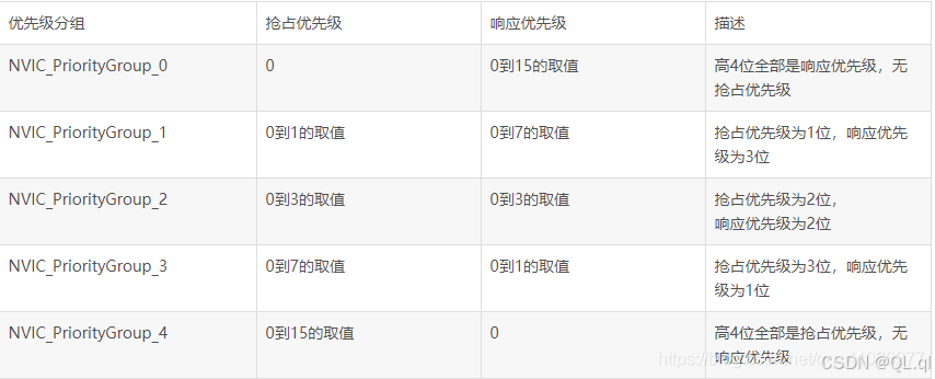 ③中断分组--NVIC_PriorityGroup_X(第X组):把16个数值分给抢占优先级、响应优先级。