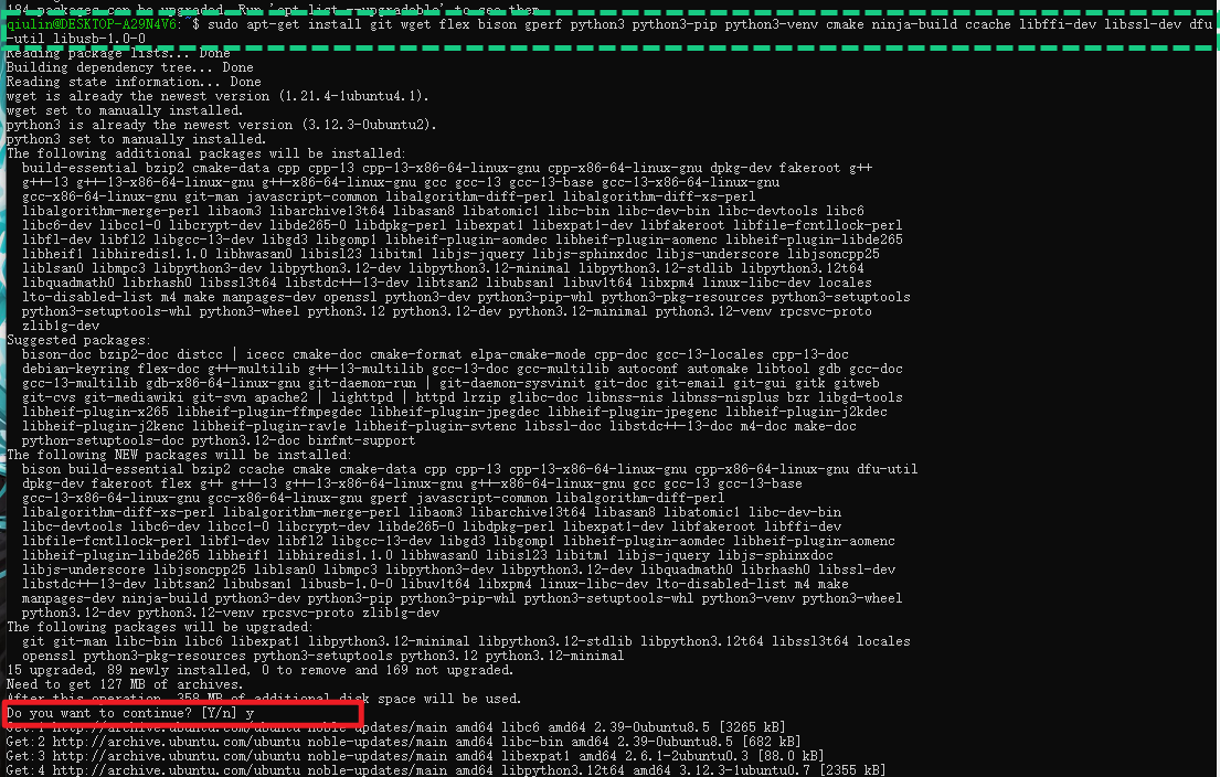 所以sudo apt update就是类似于让电脑逛一下超市知道上新了哪些东西,而接下来的espidf官方文档的指令就是购买东西,原先没逛超市所以不知道想买的东西的版本和内容,现在逛过了就可以知道慕想买东西的内容了,就可以运行下方指令了。