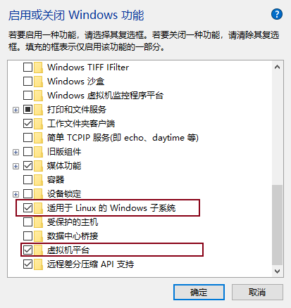 菜单搜索控制面板——>程序——>启动或者关闭Windows功能——>(滑到最下面)找到"适用于 Linux 的 Windows 子系统" 和 "虚拟机平台",检查是否被勾选。