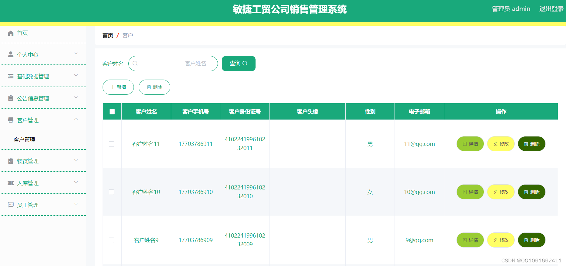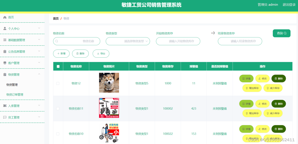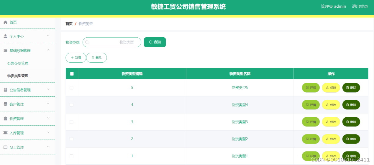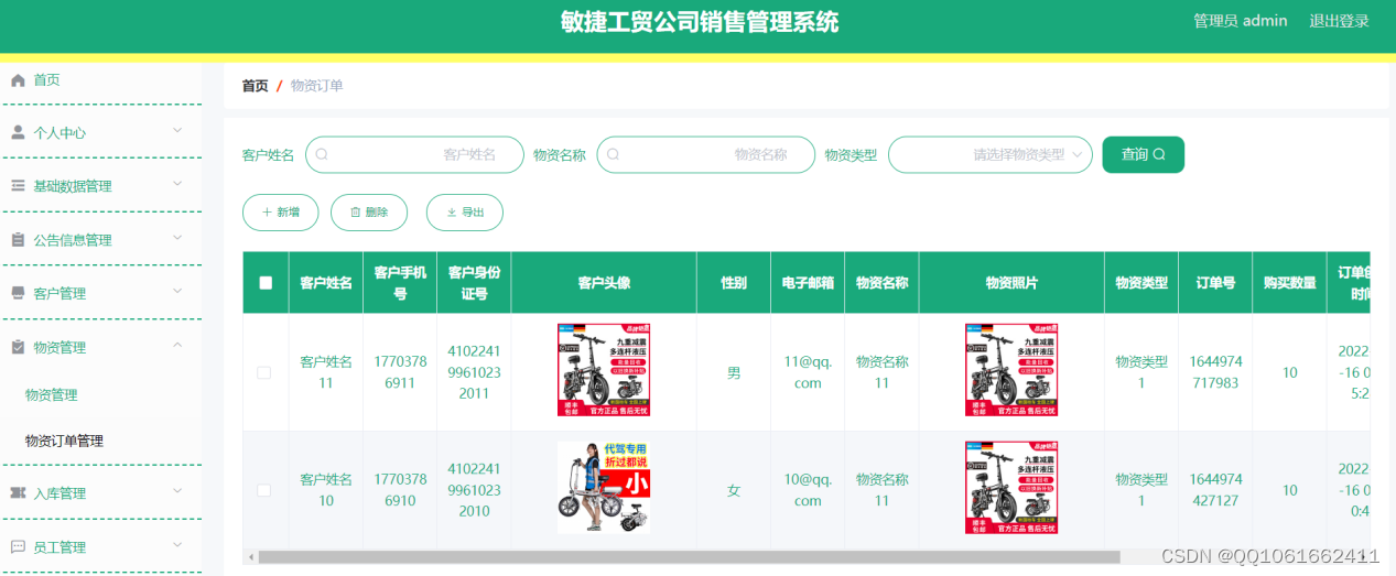 本文首先介绍了敏捷工贸公司销售管理系统的研究背景与意义,其次介绍了功能模块的总体设计,接着介绍了各个功能模块的详细设计,最后介绍了系统的功能模块展示结果和测试结果。系统主要分为管理员角色和用户角色,具体的功能设计包括注册登录管理、个人中心管理、用户信息管理、物资信息管理、订单信息管理等模块。注册登录管理功能是之前没有使用过本系统的新用户,在使用系统前,需要通过注册步骤,登记详细的信息资料,而后再通过输入正确的账号和密码,成功登录系统后,即可通过一系列的操作来满足自己的相关需求。个人中心管理功能是管理相关的个人信息资料,个人根据现实情况的需要,有选择的对个人账户的相关信息进行一定的操作,比如选择更新或者删除操作。用户信息管理是管理相关的用户信息记录,对用户相关的信息进行管理,可以及时的更新相应的用户的基本资料。物资信息管理是管理相关的物资信息记录,查看详细情况,方便及时响应用户的服务请求。订单信息管理是管理相关的订单信息记录,方便相关人员及时查看并追踪订单信息,如果遇到异常的订单信息,可以及时对其进行处理,在较短的时间内解决订单问题,提高用户的使用体验。