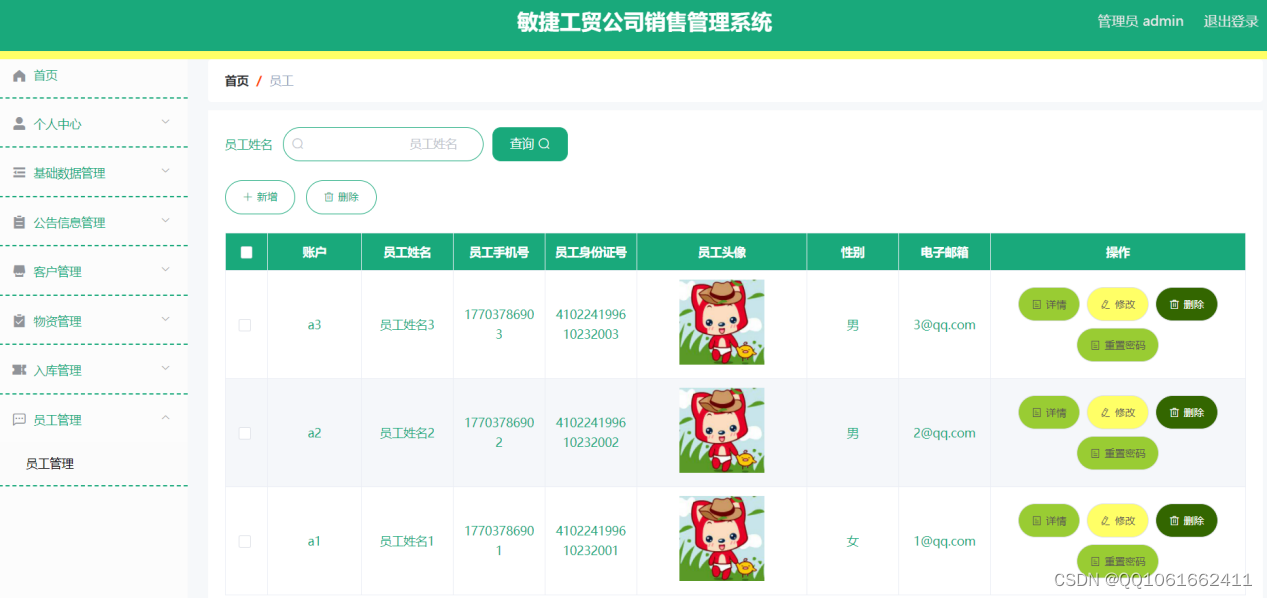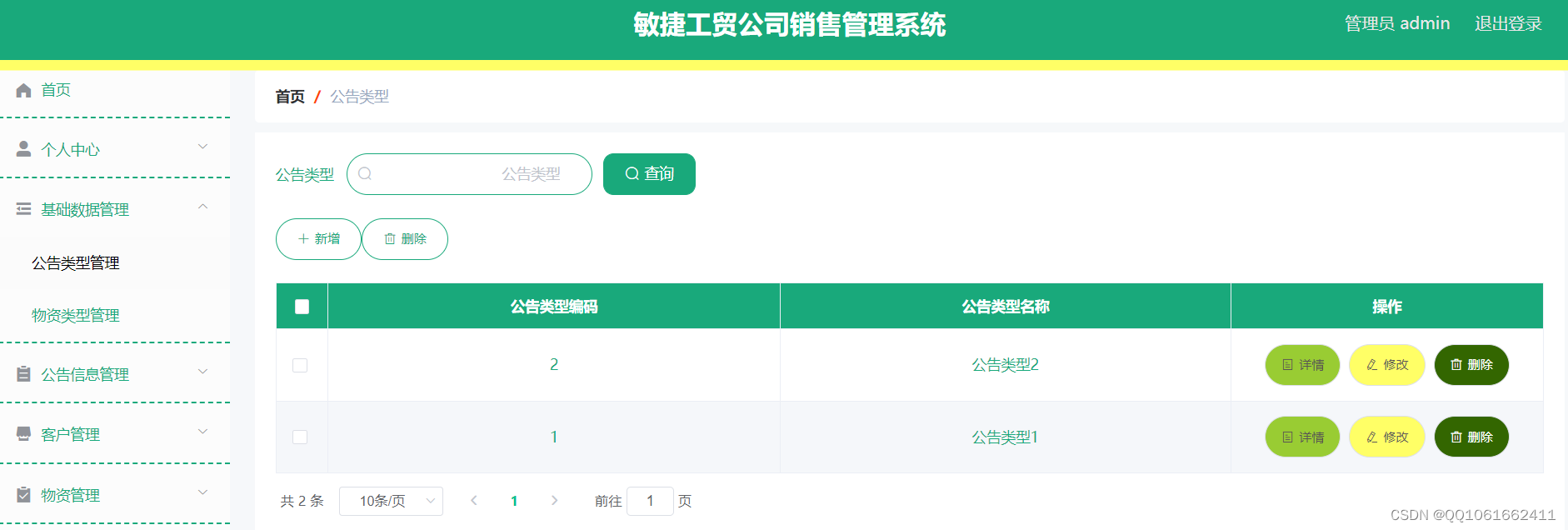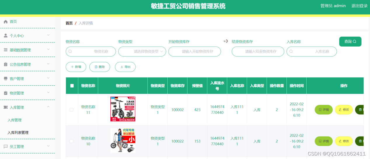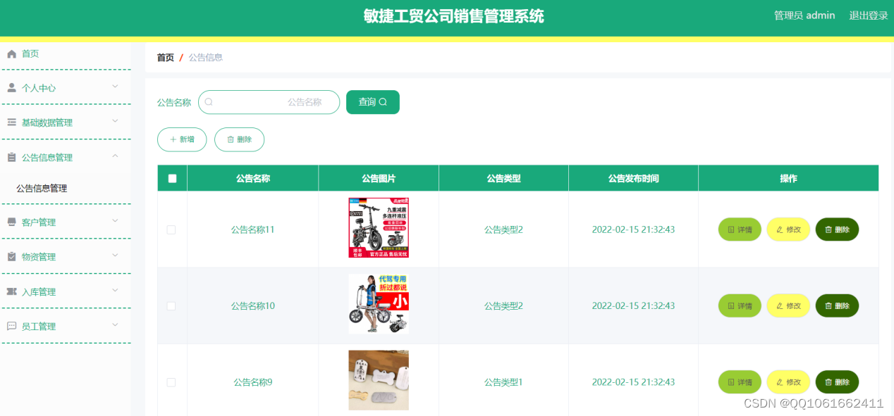 本文首先介绍了敏捷工贸公司销售管理系统的研究背景与意义,其次介绍了功能模块的总体设计,接着介绍了各个功能模块的详细设计,最后介绍了系统的功能模块展示结果和测试结果。系统主要分为管理员角色和用户角色,具体的功能设计包括注册登录管理、个人中心管理、用户信息管理、物资信息管理、订单信息管理等模块。注册登录管理功能是之前没有使用过本系统的新用户,在使用系统前,需要通过注册步骤,登记详细的信息资料,而后再通过输入正确的账号和密码,成功登录系统后,即可通过一系列的操作来满足自己的相关需求。个人中心管理功能是管理相关的个人信息资料,个人根据现实情况的需要,有选择的对个人账户的相关信息进行一定的操作,比如选择更新或者删除操作。用户信息管理是管理相关的用户信息记录,对用户相关的信息进行管理,可以及时的更新相应的用户的基本资料。物资信息管理是管理相关的物资信息记录,查看详细情况,方便及时响应用户的服务请求。订单信息管理是管理相关的订单信息记录,方便相关人员及时查看并追踪订单信息,如果遇到异常的订单信息,可以及时对其进行处理,在较短的时间内解决订单问题,提高用户的使用体验。