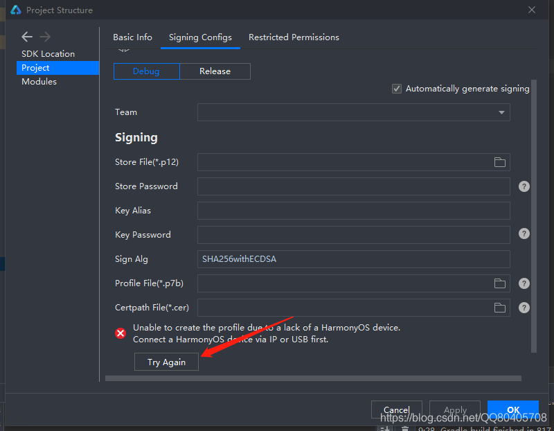 这个时候链接鸿蒙手机,点击Try Again就能获取到信息了,所有的信息都是自动生成的