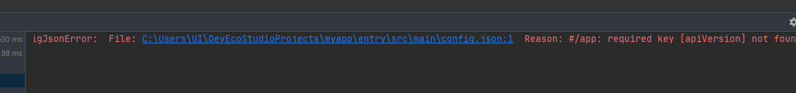 ConfigJsonError: File: C:\Users\UI\DevEcoStudioProjects\myapp\entry\src\main\config.json:1 Reason: #/app: required key [apiVersion] not found