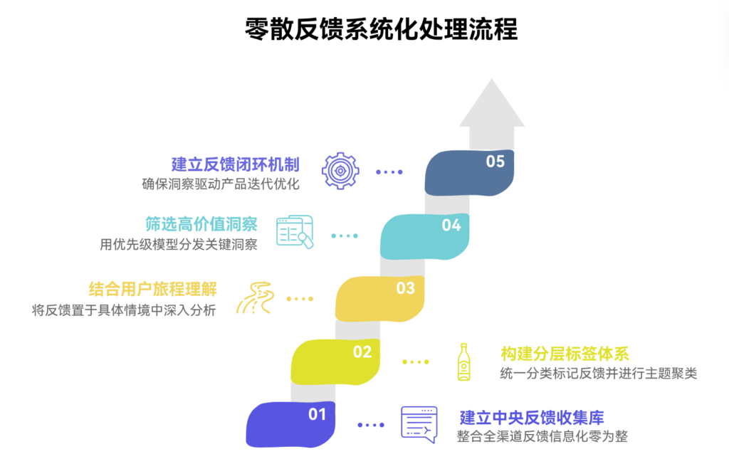 当用户反馈以零散、非结构化的形式从四面八方涌来时(如社交媒体、应用商店、客服邮件、销售电话等),许多团队会感到无所适从。要系统化地分析这些零散反馈,关键在于将其从“噪音”转变为“信号”。核心路径是:首先,建立一个全渠道的“中央反馈收集库”,实现信息的“化零为整”;其次,构建一套统一的“定性与定量”分层标签体系,对反馈进行归类、标记和主题聚类;接着,将反馈置于“用户旅程地图”的具体情境中进行理解;然后,通过优先级排序模型(如RICE)筛选出高价值洞察,并将其分发到相应团队;最后,建立一个响应和跟踪的“反馈闭环”机制,确保洞察能够真正驱动产品迭代和体验优化。 这一个完整流程,是挖掘零散反馈这座“沉睡金矿”的系统性方法。