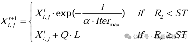 其中,t代表当前迭代数,j=1,2,3,...,d。itemmax是一个常数,表示最大的迭代次数。Xij表示第i个麻雀在第j维中的位置信息。α∈(0,1]是一个随机数。R2(R2∈[0,1])和ST(ST∈[0.5,1])分别表示预警值和安全值。Q是服从正态分布的随机数。L表示一个1×d的矩阵,其中该矩阵内每个元素全部为1。