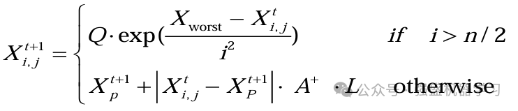 其中,Xp是目前发现者所占据的最优位置,Xworst则表示当前全局最差的位置。A表示一个1×d的矩阵,其中每个元素随机赋值为1或-1,并且A+=AT(AAT)-1。当i>n/2时,这表明,适应度值较低的第i个加入者没有获得食物,处于十分饥饿的状态,此时需要飞往其它地方觅食,以获得更多的能量。