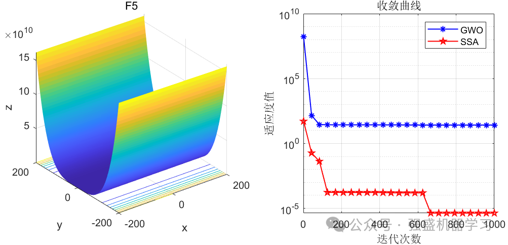 这边为了方便大家对比与理解,采用23个标准测试函数,即CEC2005,设置种群数量为30,迭代次数为1000,并与原文中的灰狼优化算法GWO进行对比!这边展示其中5个测试函数的图,其余十几个测试函数大家可以自行切换尝试!