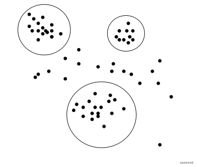 在上面所提的分类技术中,训练数据的类别是知道的,分类所需要做的是找出相关的条件去更好的区分这些类别,让误分类的概率降到最低。而在聚类中是没有已知的类标号的,或者说聚类就是为了找出类标号。如图所示,我们在开始之前并不知道这些点的类别,我们可以过K最近邻将这些点聚类成三个类,如圆圈所画的那样。在现实生活中这些点就是用户,可以用聚类的技术进行用户分群。