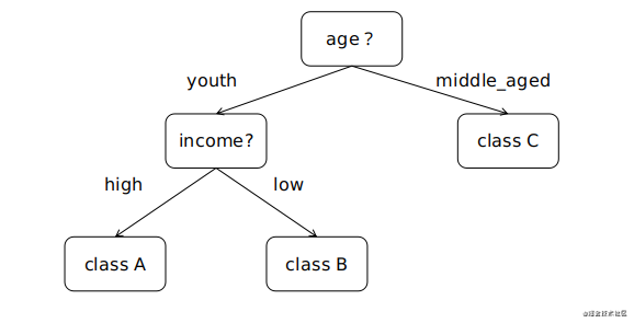 分类就是利用训练数据集找出区分和描述数据的模型,然后用这个模型去预测未知数据的类标号。概念理解比较抽象,我们以分类中常用的决策树来简单说明一下这个过程,比如我们需要对客户进行分群,因为同一个类型的客户的兴趣可能很类似,一个用户购买了商品A,和A属于同一类的用户有很大几率也对商品A感兴趣,所以我们就可以把商品A推荐给类内的其他人,这比漫无目的的推销效率要高很多。为了例子的简单我们只考虑两个属性,age和income,分类过程如下图。通过这两个属性我们可以将用户分为A ,B, C。当来了一个新用户我们知道他的age为youth,income为high,我们就可以把他归为A类,然后进行接下来的操作,如推荐商品或其他。分类技术的目的就是构造这样一个模型,然后用这个模型去预测未知数据的类别。