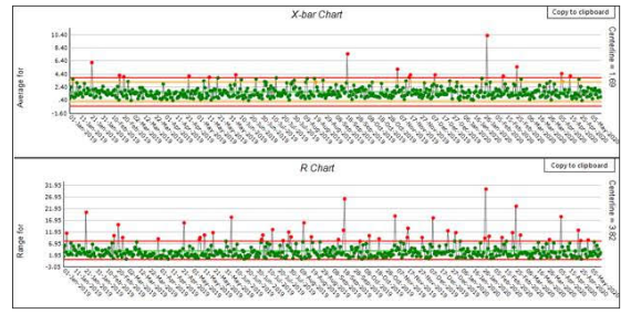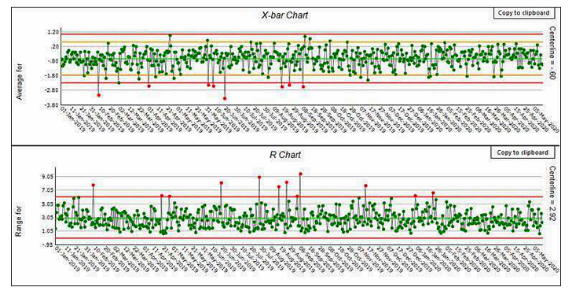 图6显示,与图1相比,该分布更正态化。然而,在500个点中,均值图有8个失控点,而极差图有12个。