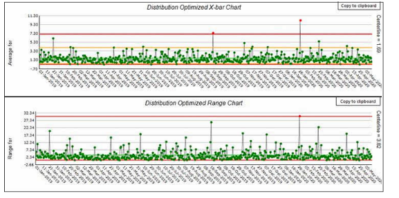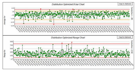 图7是基于图2控制图数据的分布优化控制图。休哈特控制图有16个超出上限的失控点,而分布优化图只有2个高于上限2个低于上限(紧紧地挨着),考虑到ARL的可变性,对于所选择的0.00135(相当于3σ的常规控制限)的概率点来说,这并不意外。极差图只有1个失控点。相比之下,使用休哈特均值图和极差图有45个失控点。