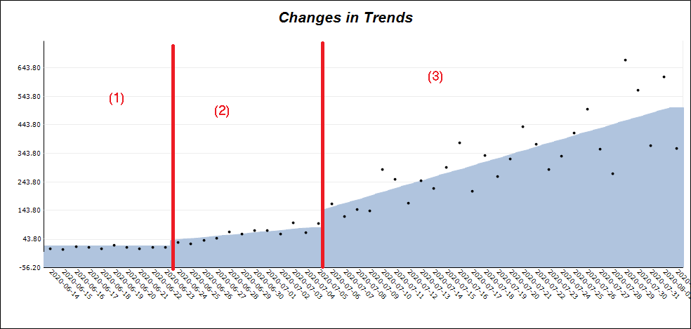图6.0展示了使用我们的技术应用于实际案例时所识别的三种趋势,这些案例所使用的数据与xxx研究所使用的数据相同。无论我们使用何种技术都无关紧要,因为从视觉上很容易看出实际点是如何紧贴线条的。对于案例发生的随机过程,预期会出现变异性的增加。