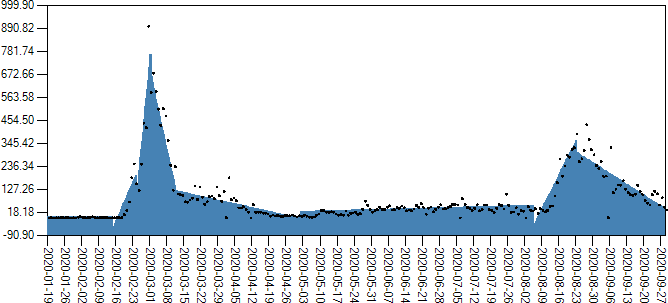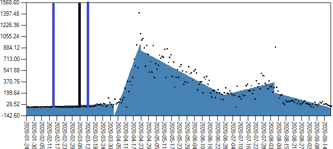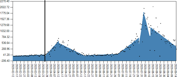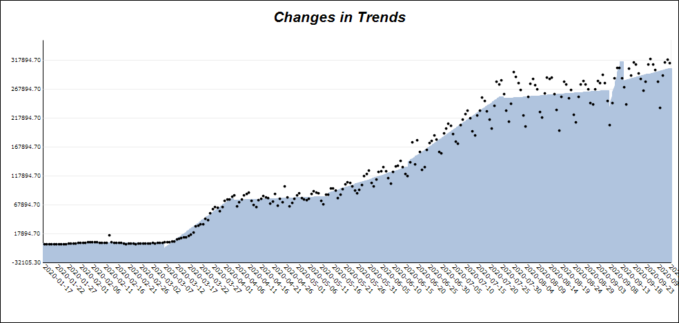 截至10月3日,全球报告的病例数已达3500万例。趋势如图7.1所示。病例数曾出现激增,现在似乎又再次呈现上升趋势。曲线呈线性分段,并不符合模型中使用的理论分布。