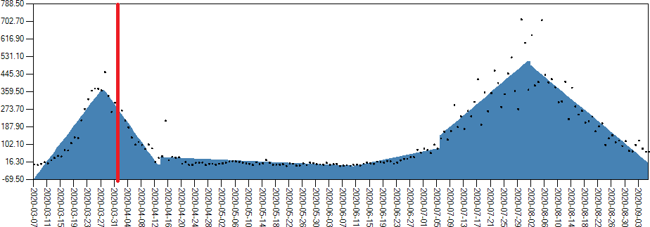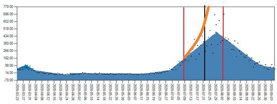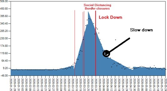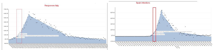 参考图7.14,如果我们仅考虑病例数,我们会得出结论:第三阶段没有产生任何差异。从开始到病情恶化之间的时间为3周。第四阶段也没有产生任何差异,因为病例数立即开始下降。至少需要7天才能观察到效果。