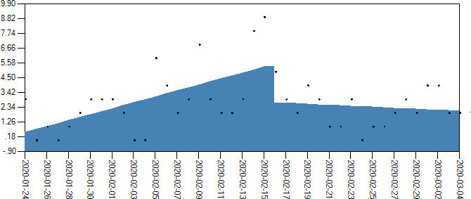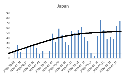 图7.7展示了日本自最初的高兴情绪之后病例的情况。与病例数趋于平稳的结论不同,图7.6中的趋势确实在持续。最终,病例数自行下降。