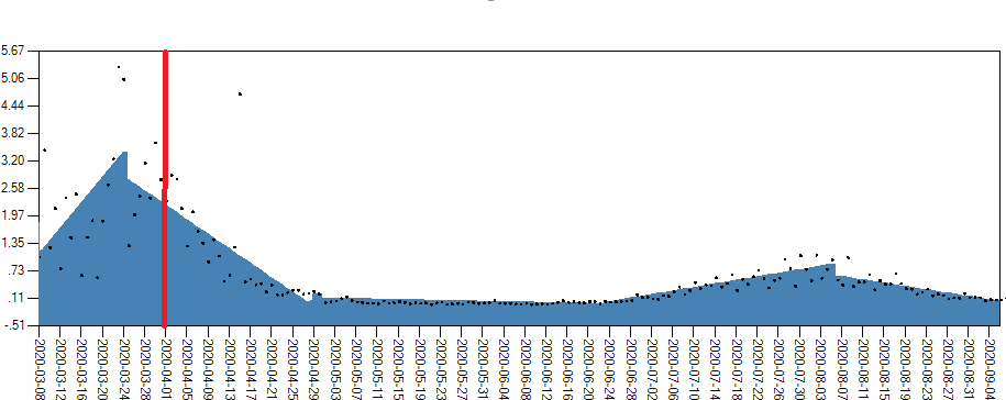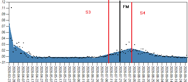 考虑到缓解措施的影响大约需要7天才能显现,因此第4阶段并未产生任何影响。感染病例本已在减少。有人可能会再次辩称,是口罩在8月3日导致了感染病例的减少,但这只是猜测。此外,本报告稍后将报告的分析显示,口罩并未对减少感染病例产生可量化的影响。可以确定的是,仅第3阶段和第4阶段并非导致感染病例下降的原因。感染病例的下降很可能是在没有干预的情况下发生的。这并不反常。感冒和流感都会自行消失,热带地区除外。它们随时都可能卷土重来。为何要将其作为研究对象呢?