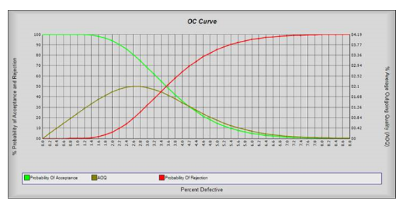 输出结果包括下图所示的OC曲线,可用于确定在假设的质量水平接受或拒绝批次的概率。例如,假设有3.5%的不合格品,则接受或拒绝该批产品的机会相等。